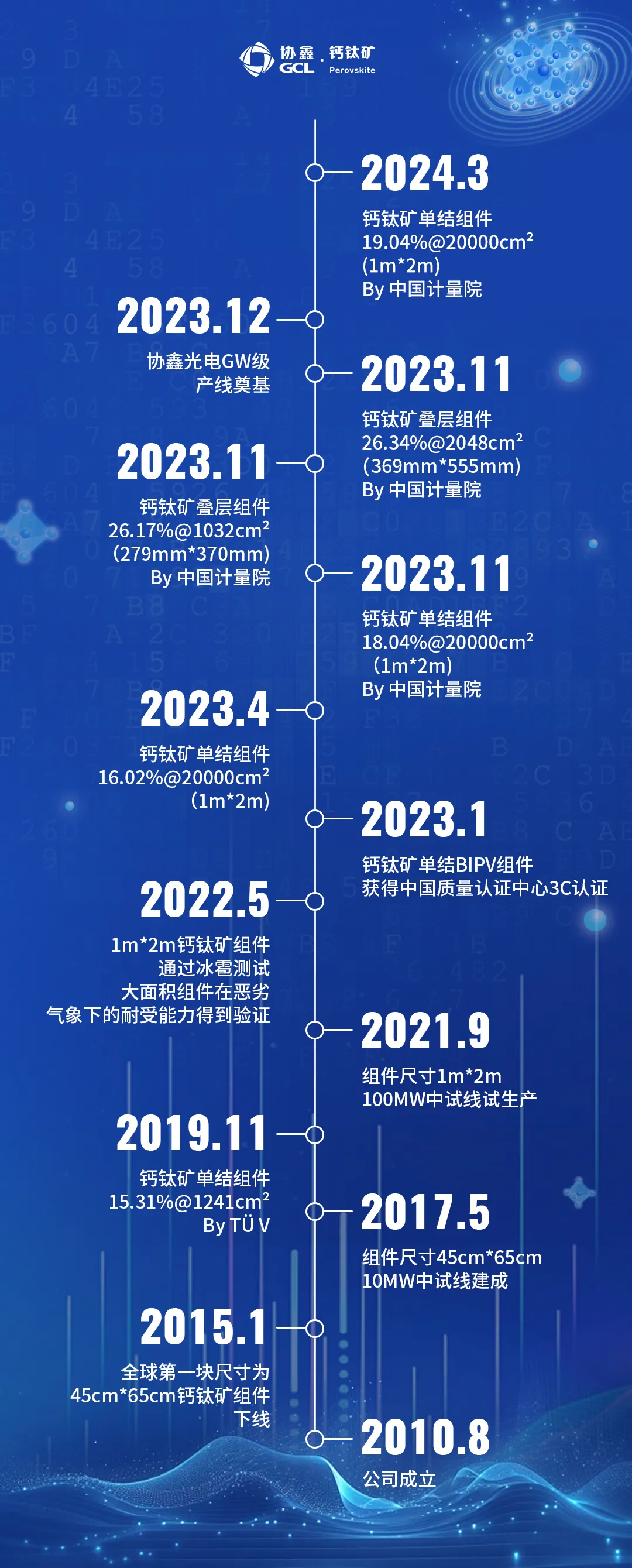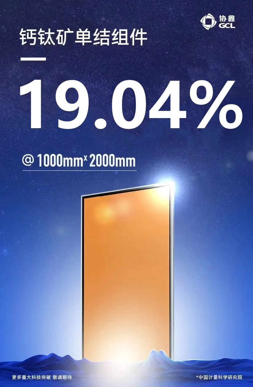 2024年3月6日,協(xié)鑫光電刷新世界紀(jì)錄,2平米全尺寸,鈣鈦礦單結(jié)組件,穩(wěn)態(tài)效率達(dá)到19.04% ----即:單結(jié)19.04%@2m² ( 1m×2m),由中國計(jì)量院認(rèn)證。