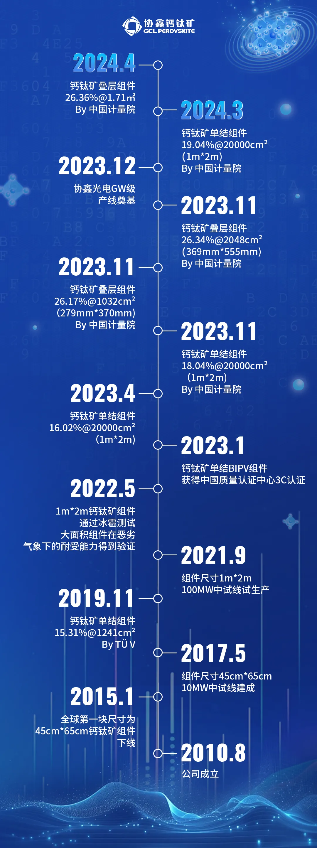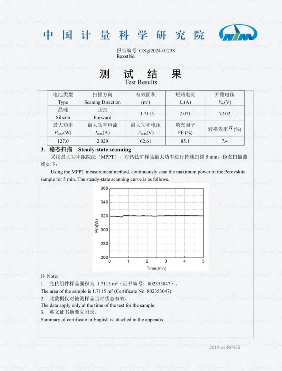 2024年4月8日,協(xié)鑫光電,疊層組件,“效率、尺寸”再一次雙雙打破世界紀(jì)錄,實(shí)現(xiàn)1.71㎡、穩(wěn)態(tài)效率26.36% ——即:疊層26.36%@1.71m² 。
